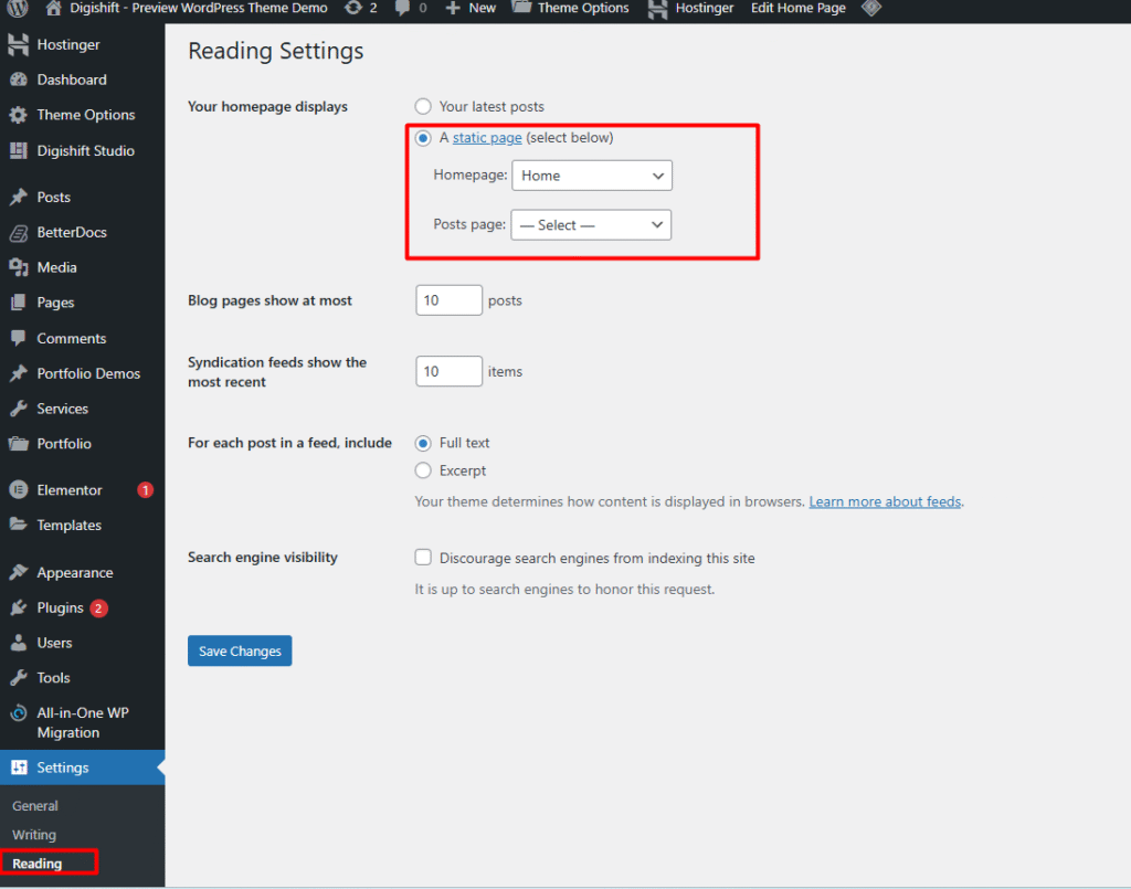 With Digishift, you can fully customize your homepage using Elementor or the built-in page templates, giving you complete flexibility over the design. Once your homepage is created, you’ll also need to assign it as the static front page in WordPress so that it displays as the main landing page for your site.