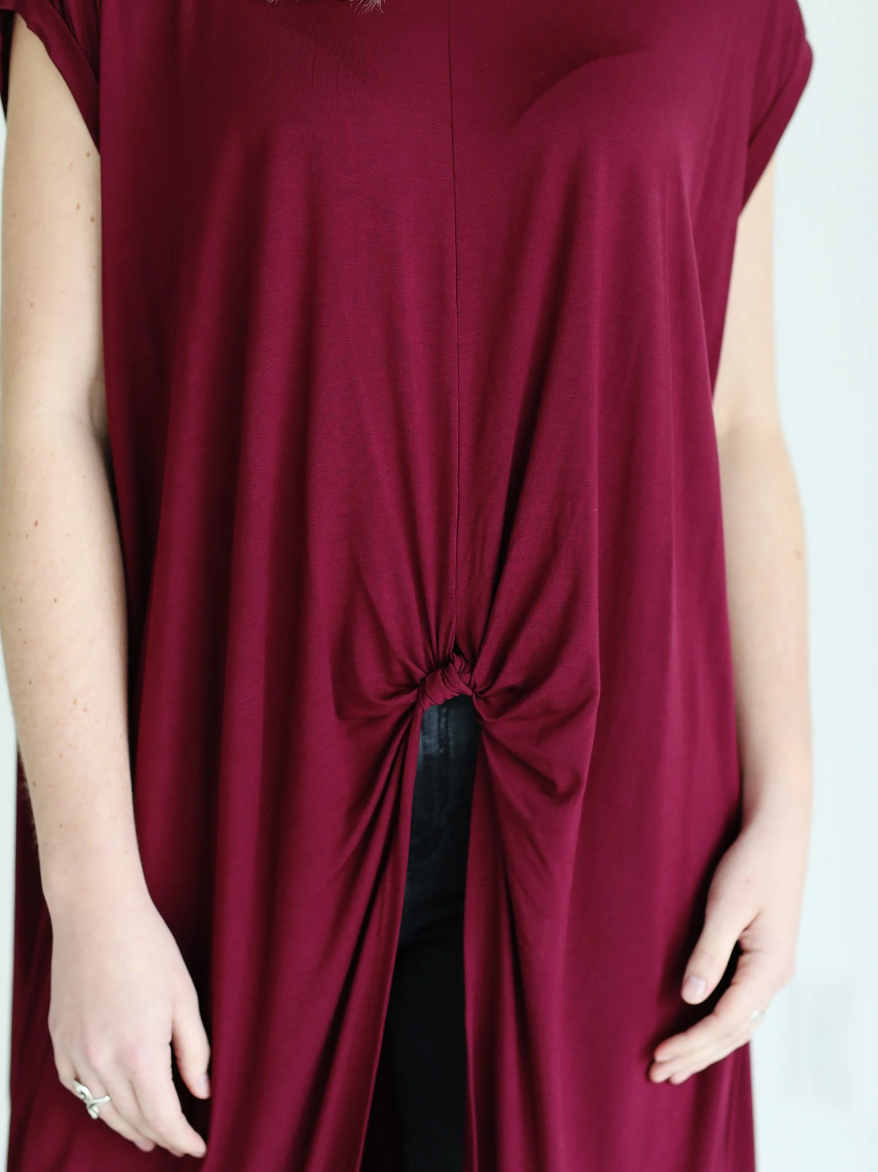 Add a stylish twist to your look with this burgundy DLMN top, featuring a front knot detail and flattering high-low hem.
