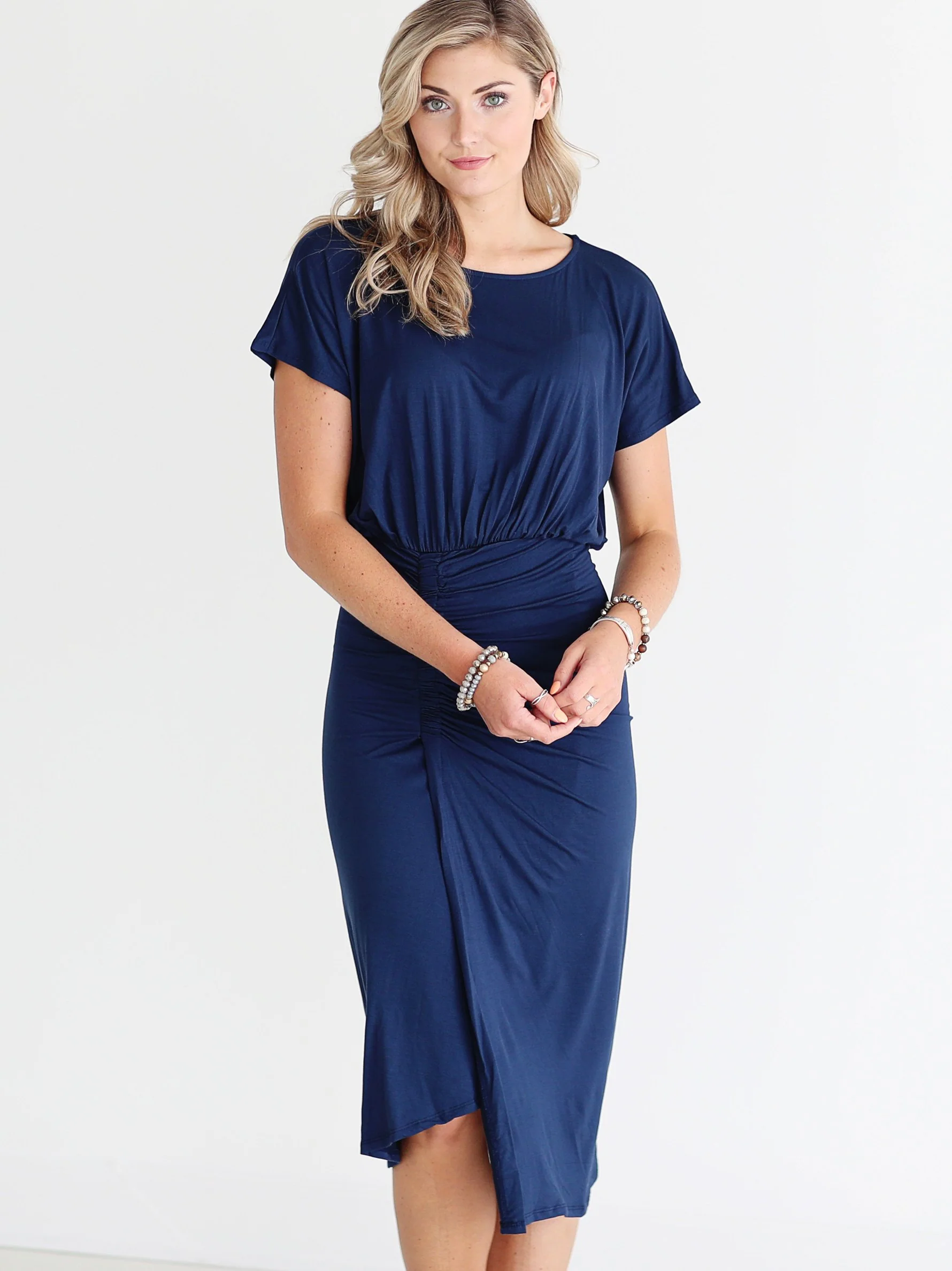 Navy DLMN Ruched Side Midi Dress