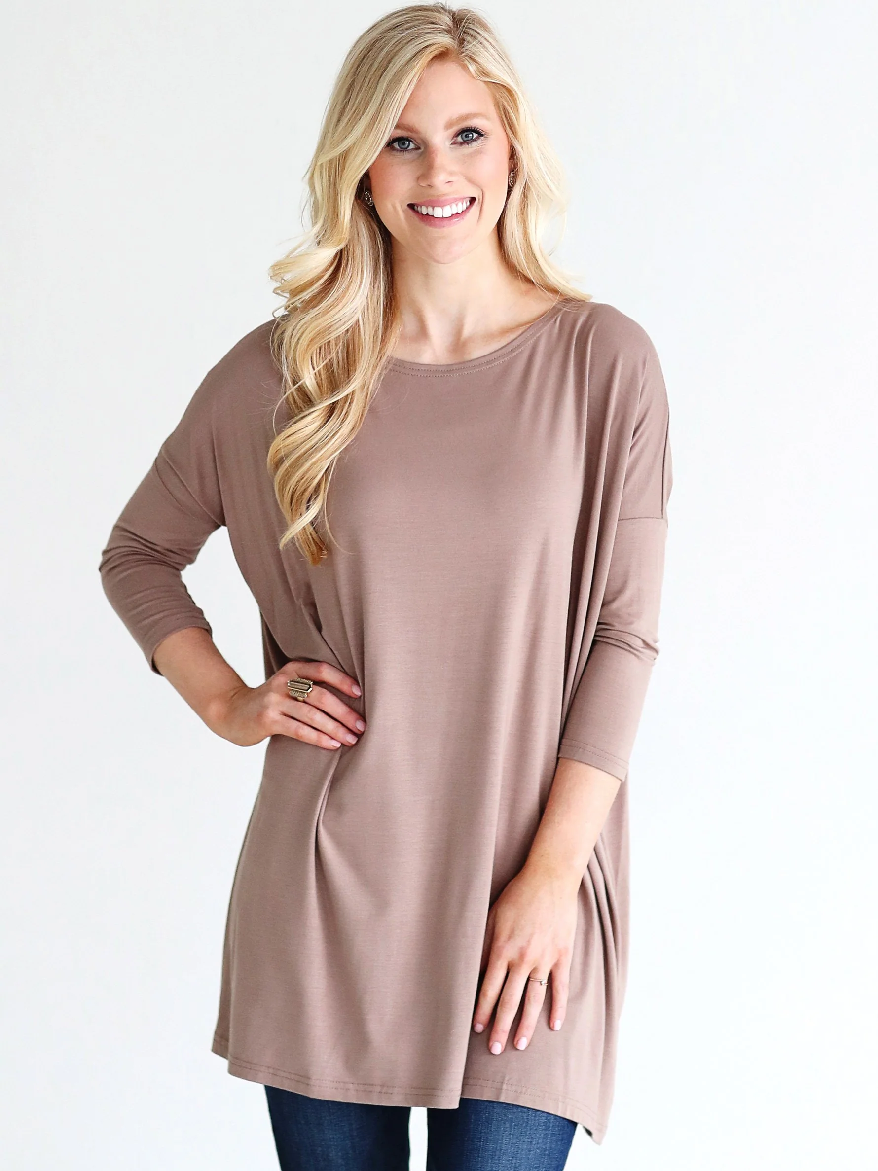 Soft and sophisticated, this taupe 3/4 sleeve tunic offers a relaxed fit and timeless style for effortless everyday wear.